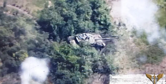 Эффектное уничтожение российского танка произошло посреди лесополосы на левом берегу Днепра, где оккупанты пытались замаскировать своего "хищного зверя".