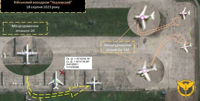 Российский следственный комитет расследует диверсию, которая произошла 18 сентября 2023 года. Были повреждены два самолета и вертолет. В ГУР заявляют, что событие вызвало истерику в высших военных коридорах, потому что на Чкаловском аэродроме базируются самолеты "судного дня" и специальные самолеты-разведчики.