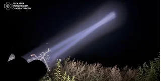 "Ночью где-то на километр такой прожектор лучом бьет в небо. Работает достаточно хорошо. Если противник попал в луч, мы по нему работаем", — рассказывает пограничник.