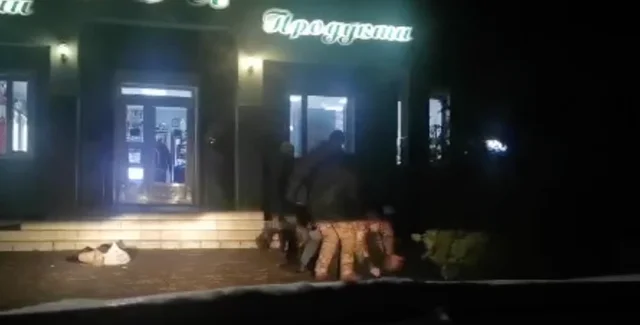 На кадрах видно, как вблизи продуктового магазина происходит драка между мужчиной в форме и мужчиной в штатском. В результате, вероятно, военный с неизвестным падают на землю и продолжают бороться уже там.