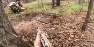 Последние несколько секунд — запись стрелкового боя, который состоялся в лесистой местности неподалеку от Крынок. В объектив камеры попали два бойца, которые пробираются через заросли. При этом они стреляют в сторону врага: заметно, как дерево, за которым прячется боец, разбито российскими пулями.