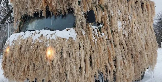 А совсем недавно в соцсетях была распространена фотка, на которой грузовик с колесной формулой 4х4 (в простонародье "буханка") был как будто одет в "парик" из соломы.