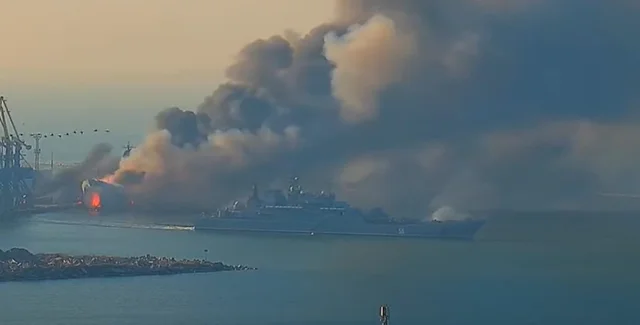 Потеря крупного десантного судна "Новочеркасск" со стороны российских военных в порту временно контролируемой Феодосии вызвала продолжительное взрывное воздействие боеприпасов и масштабный пожар. Информация о последствиях уточняется. Об этом сообщает спикер Сил обороны юга Украины Наталия Гуменюк в эфире телемарафона.