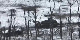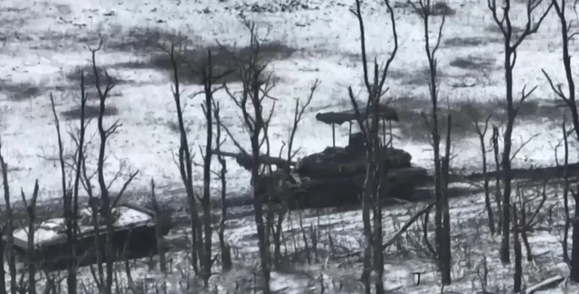 Видео, размещенное украинскими воинами, снятое с двух ракурсов — камерой разведывательного беспилотника и "глазами" FPV-дрона. Сначала показали изображение, снятое разведчиком. Видно российский танк с наваренным на башню "мангалом" — решеткой для защиты от дронов. Танк едет по заснеженной дороге, проезжает мимо бронемашины, ранее уничтоженной на данном участке фронта.