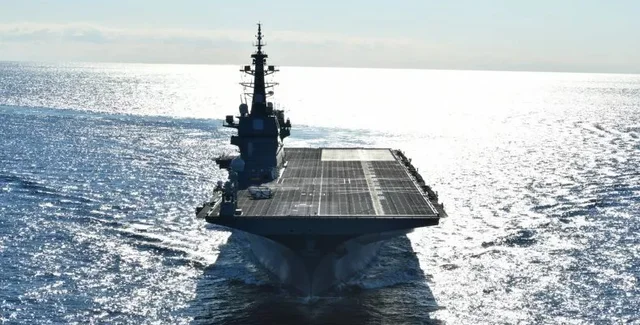 На опубликованных кадрах — эсминец JS Kaga класса "Идзумо" во время испытаний. Военный корабль переоборудовали из вертолетоносца в легкий авианосец.