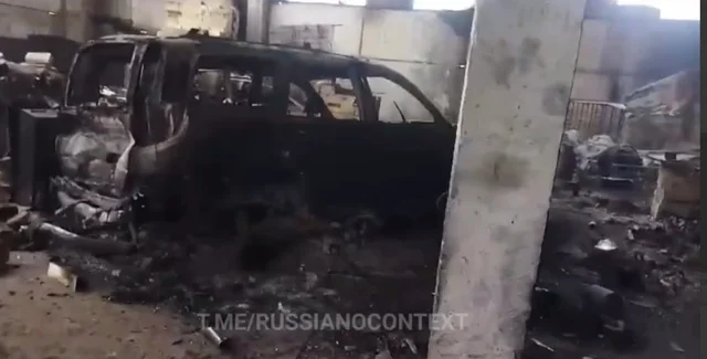 На видео, которое снял оккупанты, видно два фрагмента. Первый — сразу после прилета, где все пылает и горит, и второй — где можно увидеть последствия дроновой атаки. Машины, которые оккупанты разместили в промышленном ангаре, сгорели дотла. Все вокруг черное и обгоревшее.