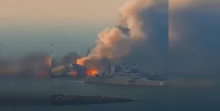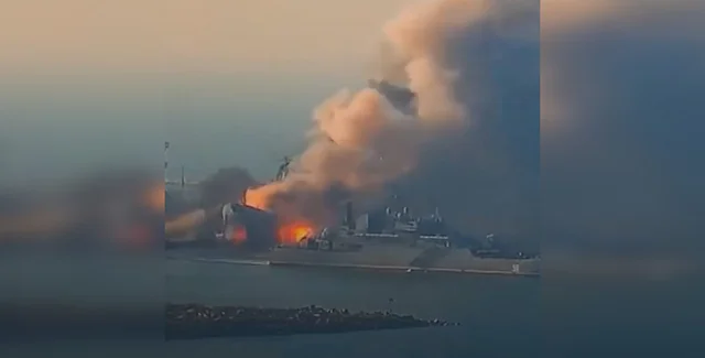 Российский корабль, который пылает после удара морских дронов ГУР | Фото: Донбасс Реалии