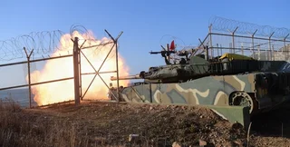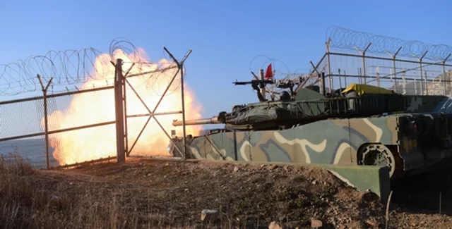 Танк K1E1 выпускает снаряд во время учений с боевой стрельбой на северо-западном пограничном острове Пэннендо | Фото: Yonhap