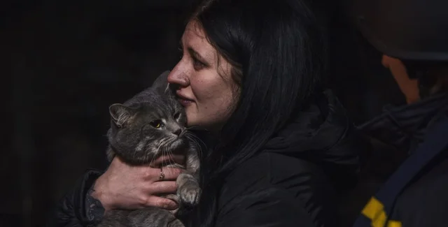 Российские ракеты прилетели в промзону и частный сектор города. Животное спасли ночью во время разбора завалов частного дома, а психолог из ГСЧС помогла ему успокоиться.