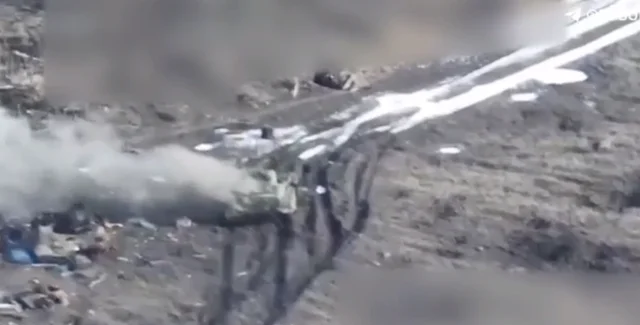 Российская БМП выехала на украинский танк почти вплотную на дороге внутри посадки. От танкового выстрела российская бронетехника загорелась внутри и продолжила движение по инерции пока не врезалась в деревья. Как заявляется, украинским танком управлял экипаж из десантной 25-й Сичеславской бригады.