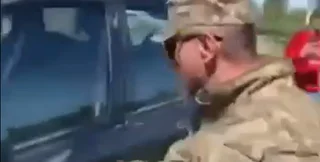 Мужчина поднимается, садится в машину и кому-то звонит. Гражданские открывают дверь машины и продолжают кричать на военного со словами "Что ты пистолетом машешь?". Тот в ответ говорит: "Вы на меня напали! Я не бил никого".