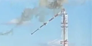 В сети опубликовали момент удара по телебашне, в результате чего ее верхняя часть падает.