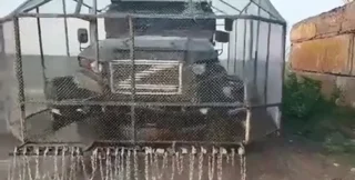 Necro Mancer отыскал запись, на которой военные ВС РФ хвастаются бронемашиной З-СТС "Ахмат". На видео можно разглядеть металлическую конструкцию, приваренную к кабине машины. К металлическим ребрам прикреплена сетка, которая закрывает всю поверхность машины почти до самой земли. Чтобы добраться внутрь, предусмотрена специальная дверь. Чтобы усложнить доступ дронов снизу, к нижнему краю пристроили цепи.
