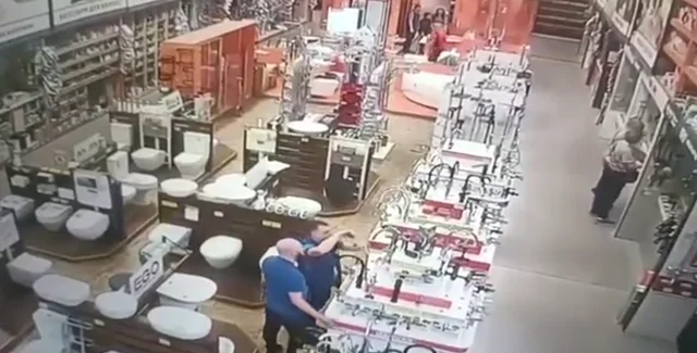 В отделе сантехники, который в поле зрения камеры, на момент удара находилось по меньшей мере восемь человек — двое работников и шестеро посетителей.