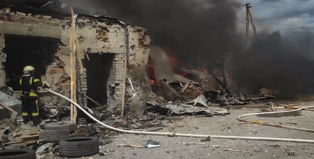 Под вражеским обстрелом оказались гражданские объекты: кафе, автомагазин и шиномонтаж. В результате удара возник пожар. Огонь распространился на 300 кв. м. Спасатели оперативно ликвидировали пожар.