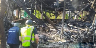 На фотографиях, опубликованных Харьковской прокуратурой, можно увидеть последствия прилета С-300 по пансионату. От одного из разрушенных сооружений остался лишь обожженный каркас. У соседнего дома вынесло верхние этажи.