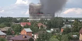 Российские пожарные привлекли к тушению огня два вертолета, рассказали росСМИ. Огонь выжег три этажа, а внутри до сих пор могут находиться люди, утверждают спасатели.