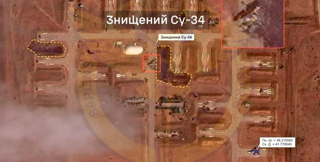 "Данные космической разведки свидетельствуют — в результате огневого поражения военного аэродрома государства-агрессора России "Морозовск" в Ростовской области 3 августа 2024 года уничтожен истребитель-бомбардировщик Су-34. Еще два российских самолета такого же типа вероятно повреждены обломками — рядом с бортами зафиксированы воронки от взрывов", — говорится в сообщении.