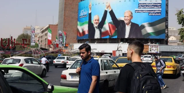 Баннер с Исмаилом Хания и Масудом Пезешкианом в центре Тегерана | Фото: Asharq Al-Awsat