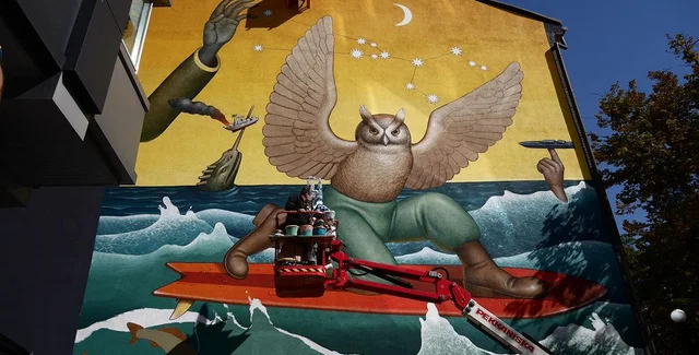 На переднем плане мурала изображен символ ГУР — сова. Позади нее рука, которая символизирует невидимую работу ГУР.