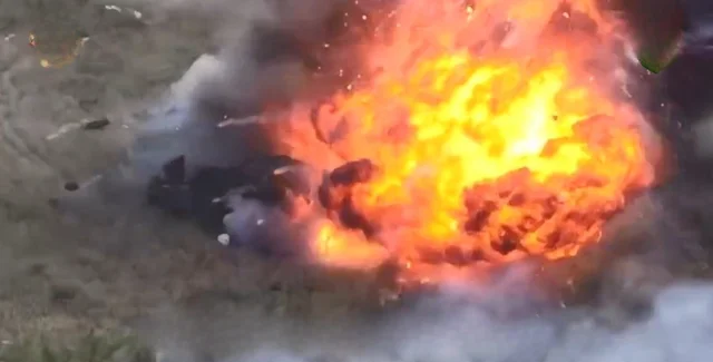 Кадры удара по бронетехнике ВС РФ появились в сети утром 26 сентября. Место событий не указано. Первые секунды записи показывают две бронемашины, которые стоят посреди поля. В какой-то момент появляется изображение, которое транслировал FPV-дрон ВСУ. На подлете видим, что россияне обшили бронемашину пластинами металла, которые плотно укрывают верхнюю часть корпуса. Впрочем, пластины не помешали беспилотнику, который нашел щель для атаки: подлетел снизу и ударил в незащищенное место на уровне колес. На следующих кадрах над БМП сначала поднимается легкий столб дыма, затем прилетает еще один БПЛА, который целится в соседнюю машину. Со временем начинается пожар. Последние кадры — мощный взрыв, вероятно, боекомплекта, который разносит обе БМП на куски: некоторые обломки подлетают вверх, а затем рассыпаются на поле вокруг.