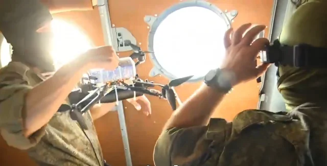 На кадрах один из российских солдат надевает FPV-очки, а другой открывает дверь вертолета и выпускает БПЛА над водой. Оператор, используя камеру от первого лица, управляет дроном, который летит на малой высоте над поверхностью воды, хотя в кадре не видно цели.