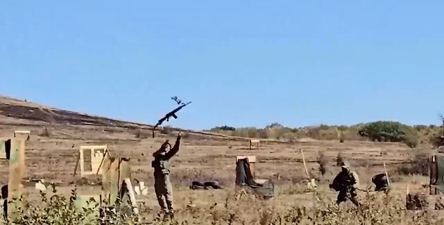 Перед отправкой в Украину солдат РФ учат отбиваться от дронов ВСУ броском автомата (видео)