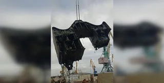 Сообщается, что россияне распространили фото с форума "Авиабаза", на котором, как заявляется, можно увидеть остатки российского крупного десантного корабля проекта 775 "Новочеркасск". Судно достают по частям. На упомянутом фото можно заметить часть кормы.
