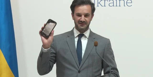 Представитель МИД Украины поблагодарил журналистов, которые пришли несмотря на утренние российские обстрелы и плохую погоду, а затем вытащил из кармана и показал свой мобильный телефон.