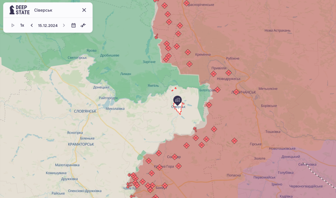Российские силы провели механизированную атаку численностью примерно в батальон в направлении Северска после недавней смены командования в этом районе. Геолокационные кадры, опубликованные 15 декабря, показывают, что российские силы незначительно продвинулись во время механизированной атаки численностью примерно в роту к северу от Веселого.