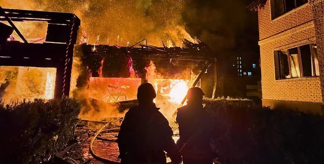 В ГСЧС Киевщины подтвердили, что в Крюковщине обломки БПЛА вызвали пожар в частном доме (200 кв.м). Огонь потушили в 01.54.