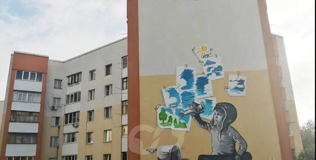 Второе фото показывает еще один дом, на котором россияне нарисовали мурал на военную тематику с ребенком в форме "летчика". Внешний фасад прикрыт сеткой с одной стороны, а на часть, которая выходит во двор, защиты не нашлось.