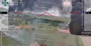 В кадре видно взлет БПЛА и то, как он без помех преодолевает значительное расстояние и залетает на территорию аэропорта, с которого уже поднимается дым от ранее пораженных самолетов.