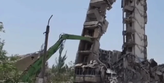 На кадрах можно увидеть, как остатки многоэтажного дома демонтирует экскаватор.