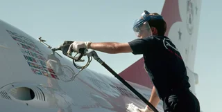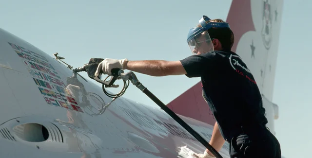 - Для защиты от погодных условий и насекомых наносится уплотнитель из винилового пластика под названием Spraylat — обычно два слоя, сначала черный, затем белый. Затем F-16 буксируют на стоянку на огромном кладбище самолетов за пределами города Тусон, штат Аризона.