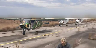 На другом фото — военнослужащий и шесть ФАБов. Позади — два бомбардировщика "Горыныч" в боевых цветах. Также видим аэродром, с которого взлетают дроны-дипстрайк, выстланный плитами.