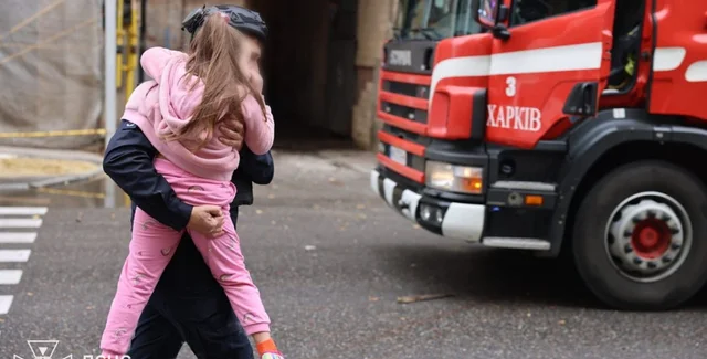 Спасатели уносят детей подальше от разрушенного детсада в Харькове | Фото: ГСЧС