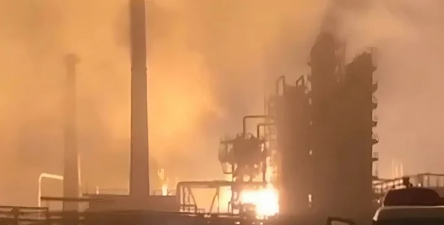 В Telegram-канале OSINT-аналитика "Dnipro Osint ⟨ Гарбуз ⟩" провели геолокацию кадров с пожаром на Рязанском НПЗ. Удалось установить, что горит АВТ-2 первичной переработки нефти в точке с координатами 54.56280639879809, 39.737499810376164. Кроме того, отмечается, что удар могли нанести ракето-дронами "Пекло": подтверждений и источников не предоставили.