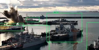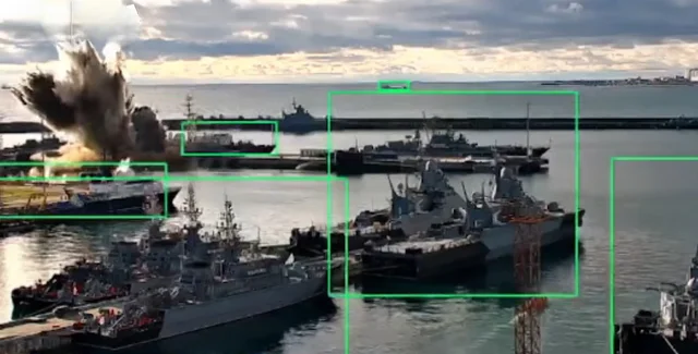 Во-вторых, в кадр попали другие ценные корабли российского флота. Среди них — один из двух ценных, хоть и старых, фрегатов класса Krivak, два-три корабля разминирования проекта Alexandria, два патрульных корабля класса "Быков", корабли класса "Ропуха-1", "Буян", а также разведывательный. Камера показывает, что украинцы подключили систему распознавания изображений, поэтому четко идентифицировали цель — одну из трех субмарин, которые паркуются в привычном месте.
