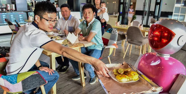 Несколько роботов-официантов обслуживают клиентов ресторана в городе Иу (провинция Чжэцзян, Китай). Автор идеи – 22-летний студент-второкурсник Сюй Жиньжин, изучающий гостиничный менеджмент. Синий робот-мальчик и розовый робот-девочка помогают сделать заказ, доставляют еду по магнитной ленте и желают приятного аппетита. Сюй Жиньжин рассказал, что уже связался с дизайнерами с тем, чтобы заказать еще нескольких роботов.