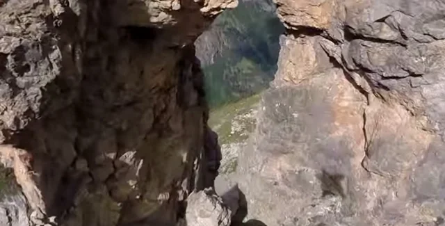 Итальянский бейсджампер Ули Эмануэле пролетел через расщелину в скале шириной около двух метров. Свой прыжок он снял на несколько камер, прикрепленных к шлему и костюму.