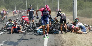 Примерно за 60 км до финиша 3-го этапа "Тур де Франс"-2015, когда отрыв дня был пойман, в первых рядах пелотона произошел массовый завал