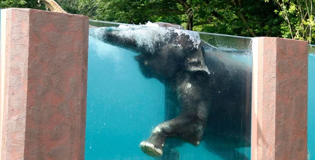 Японский зоопарк (г. Фудзи) построил 65-метровый бассейн для слонов, имеющий прозрачные стены, чтобы посетители могли наблюдать за купанием самых крупных наземных млекопитающих.