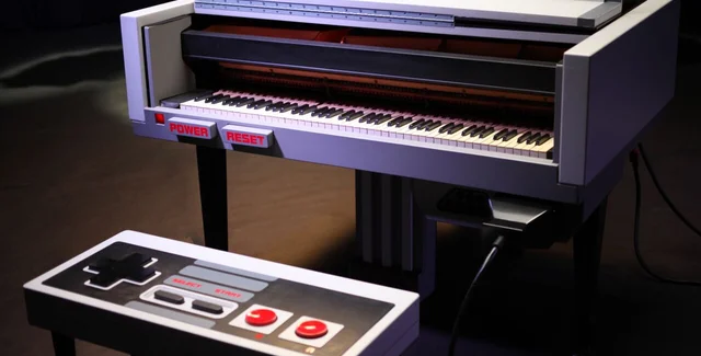 К необычному пианино прилагается не менее оригинальный табурет в форме джойстика
