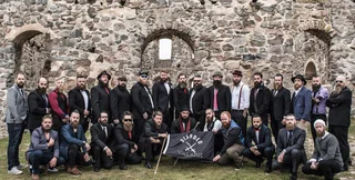 Глава шведской организации "Бородатые злодеи" вместе с другими членами организации устроили фотосессию в разрушенном замке с черно-белым флагом организации.