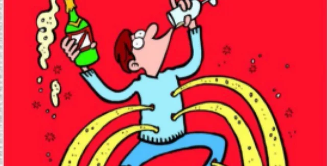 На рисунке изображен мужчина с бокалом и бутылкой шампанского в руках. Напиток выливается через пулевые отверстия в его теле. Под карикатурой также есть подпись: "У них есть оружие. Да пошли они, у нас есть шампанское".