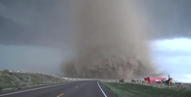 На кадрах видно, как торнадо формируется высоко облаках, после чего превращается в огромный столб пыли и грязи, уничтожающий все на своем пути. При этом автомобиль с людьми, снимающими непредсказуемую природную стихию, находится всего в нескольких сотнях метров от него.
