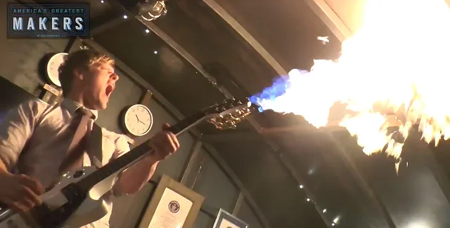 Британский изобретатель Колин Ферз решил смастерить "огненную гитару" собственной конструкции, как в фильме "Безумный Макс", сообщает "Популярная механика".