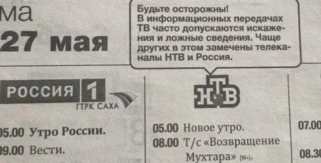Газета "Якутск вечерний" разместила в разделе телепрограммы предупреждения о возможных "ложных сведениях" в программах центральных каналов России.