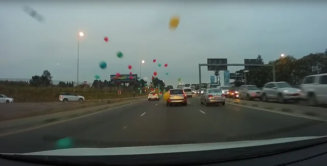 Пользователь Мэттью Рорк опубликовал на YouTube запись с авторегистратора. На видеозаписи видно, что водитель едет по трассе, а из проезжающего мимо легкового автомобиля летят шарики.